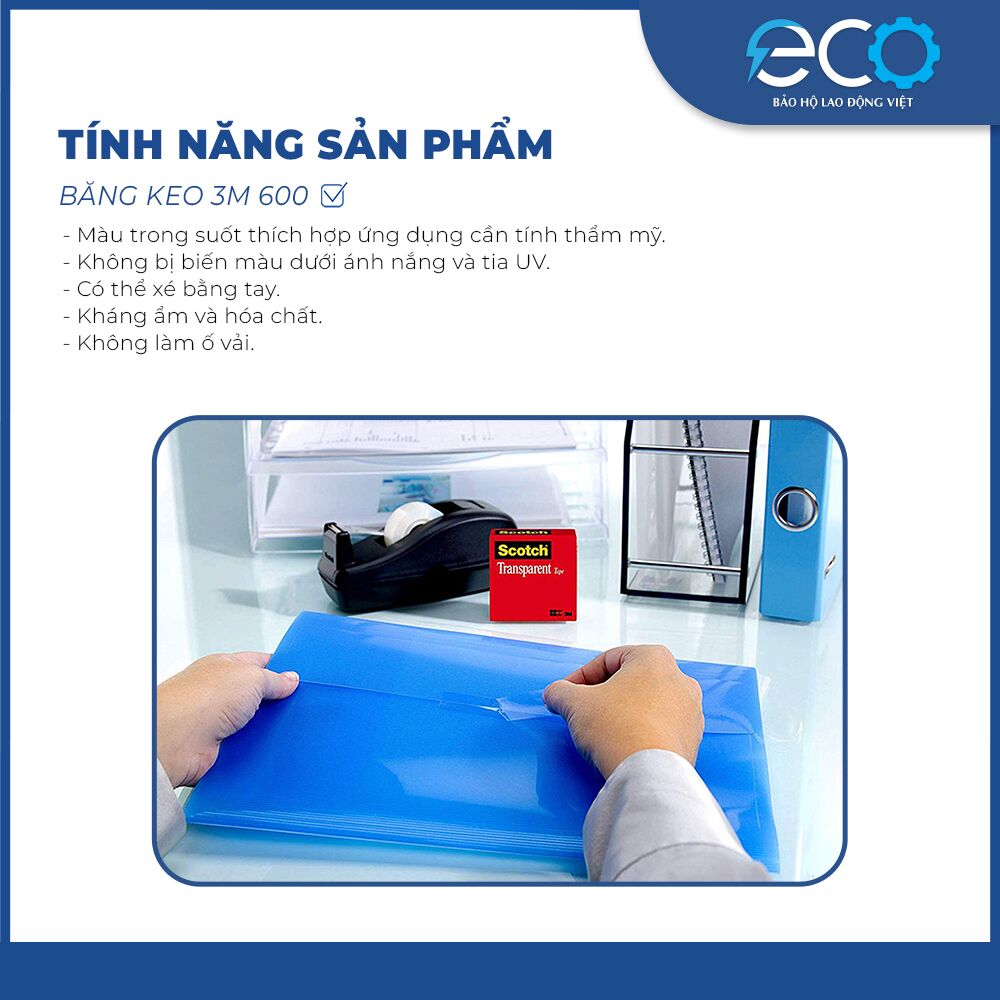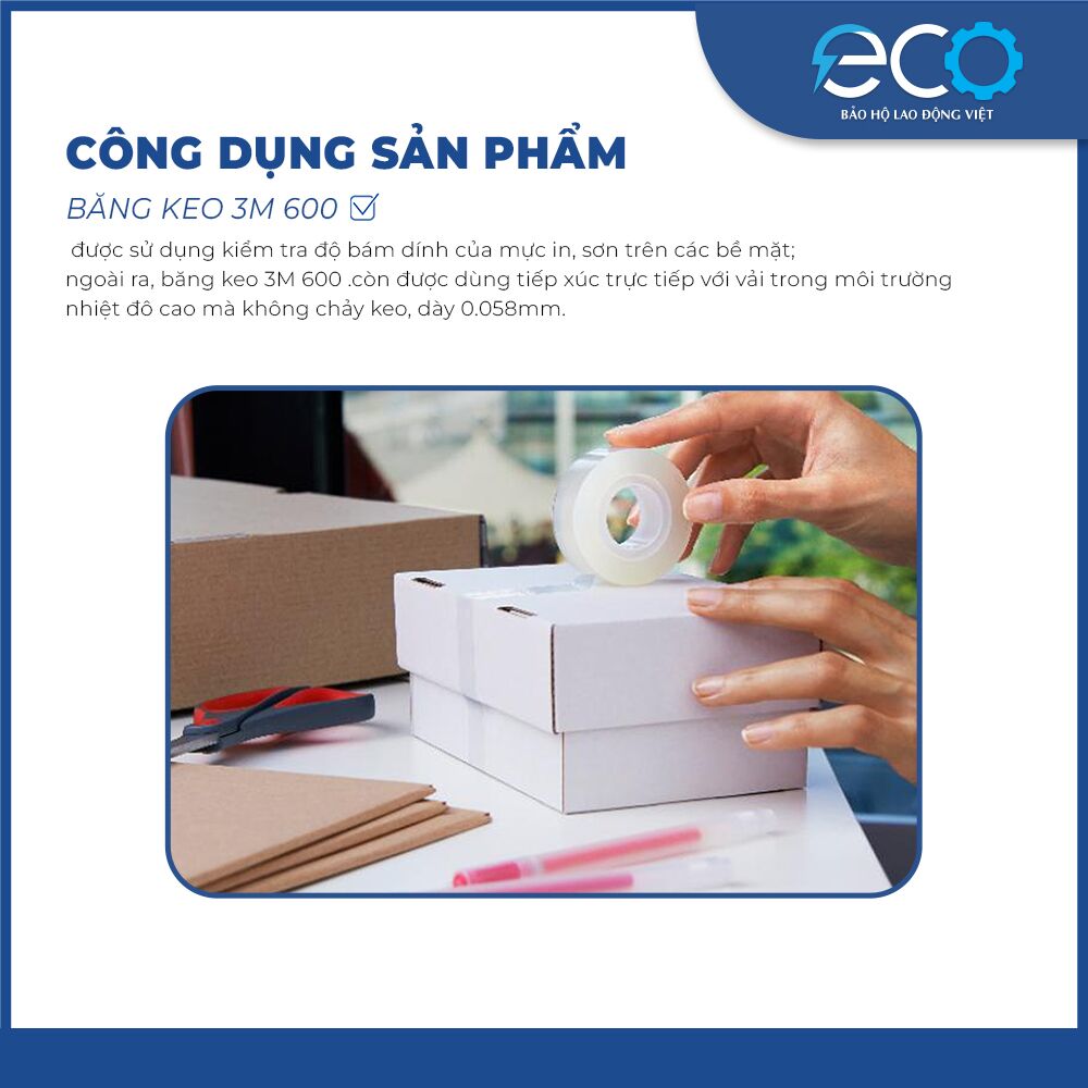 Băng keo 1 mặt 3M 600 được sử dụng kiểm tra độ bám dính của mực in, sơn trên các bề mặt; ngoài ra, băng keo 3M 600 .còn được dùng tiếp xúc trực tiếp với vải trong môi trường nhiệt đô cao mà không chảy keo, dày 0.058mm.