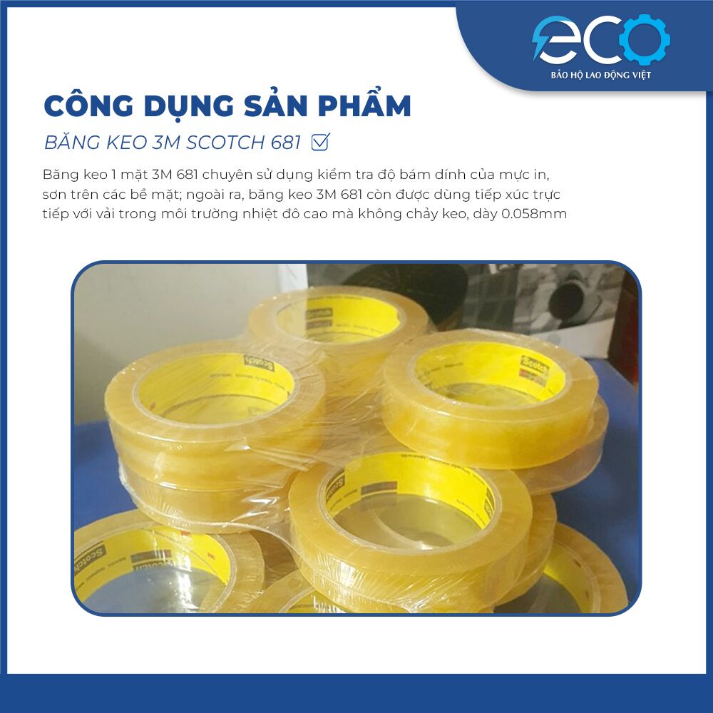 Băng keo 1 mặt 3M 681 chuyên sử dụng kiểm tra độ bám dính của mực in, sơn trên các bề mặt; ngoài ra, băng keo 3M 681 còn được dùng tiếp xúc trực tiếp với vải trong môi trường nhiệt đô cao mà không chảy keo, dày 0.058mm với các đặc tính:
