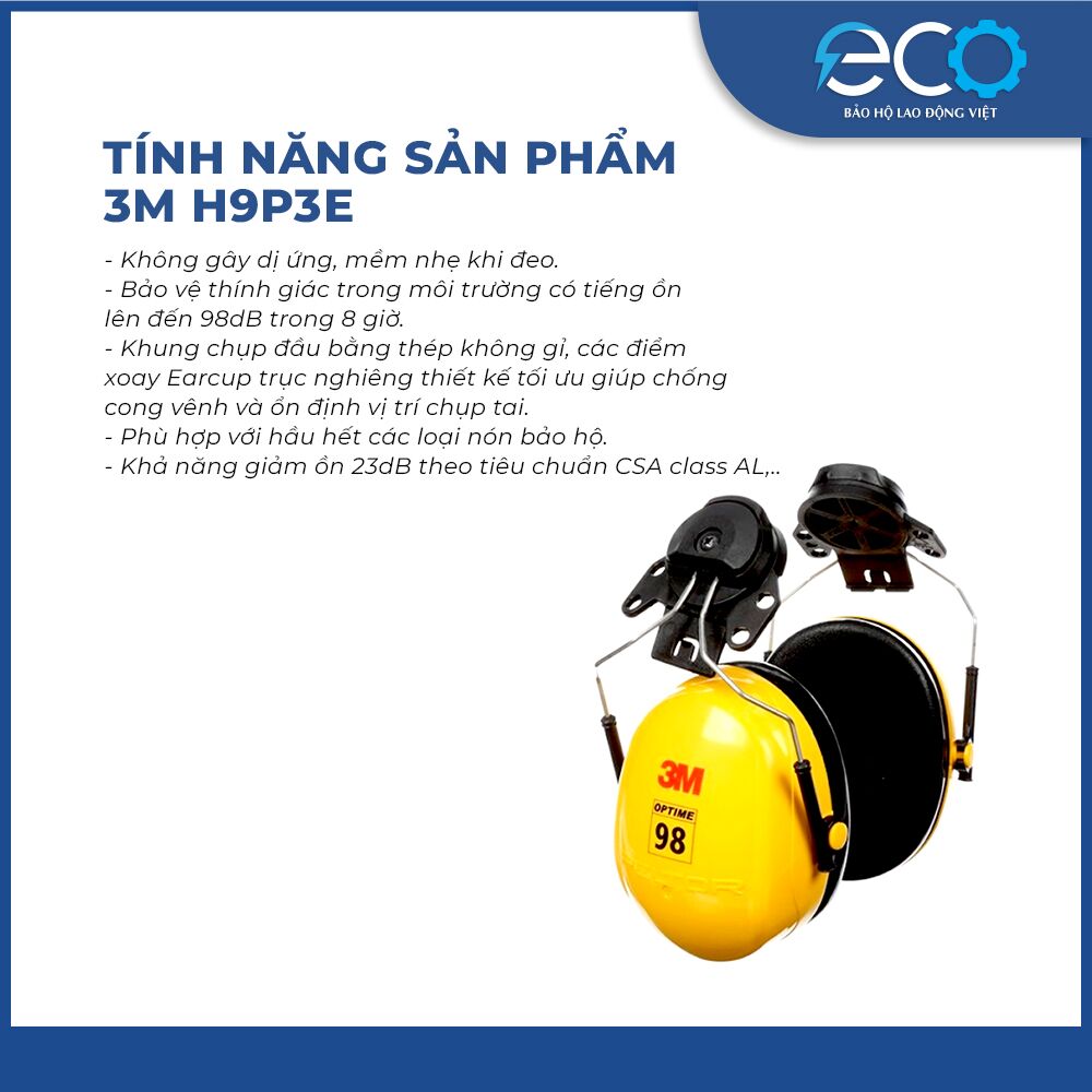 Chụp Tai Chống Ồn 3M H9P3E loại sử dụng kết hợp với nón bảo hộ, giúp bảo vệ thính giác người dùng trong điều kiện môi trường nhiều tiếng ồn lên đến 98dB trong 8 giờ.