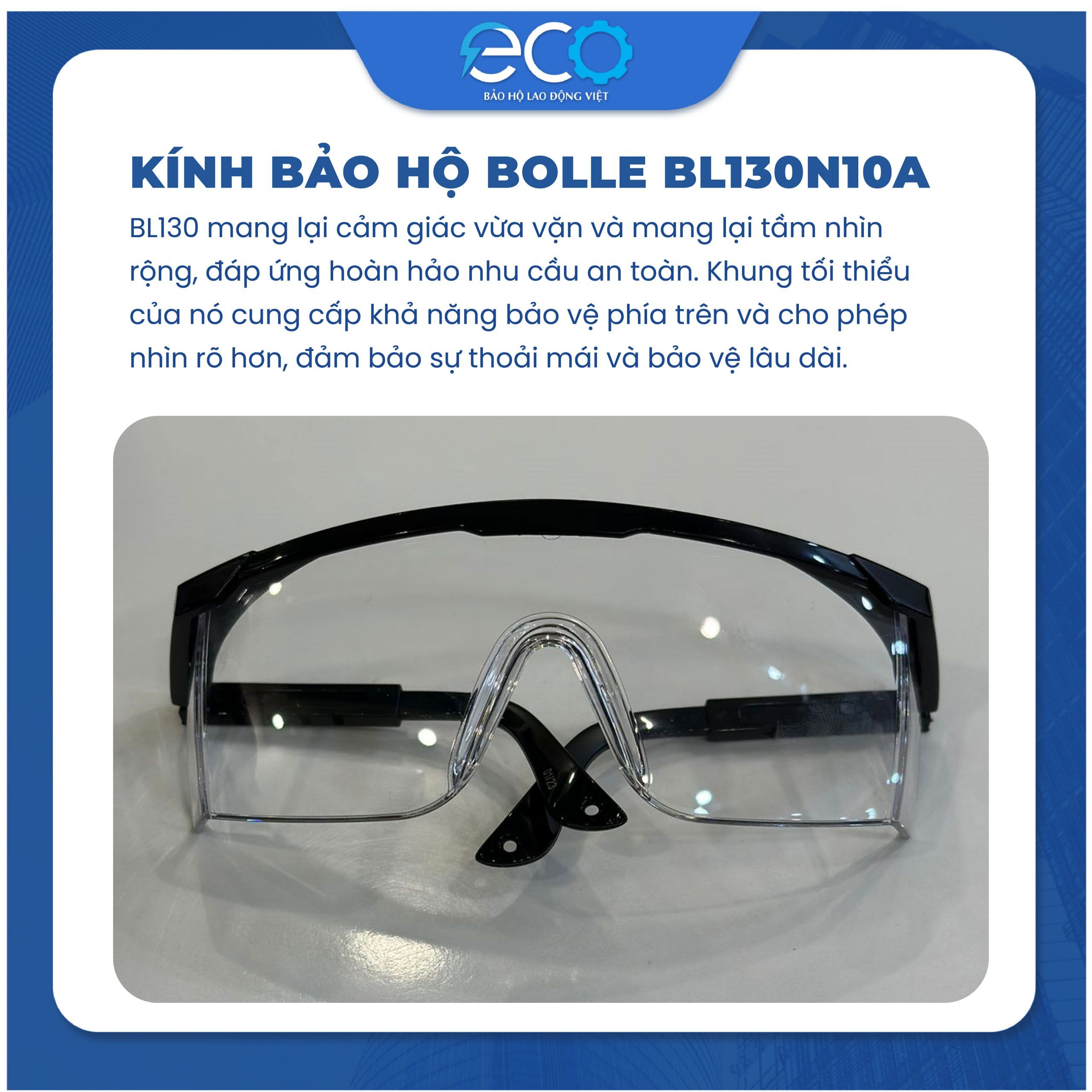 - Kính bảo hộ chống hoá chất Bolle BL130N10A Pháp có khung kính màu đen, được làm từ chất liệu Polycarbonat chắc chắn