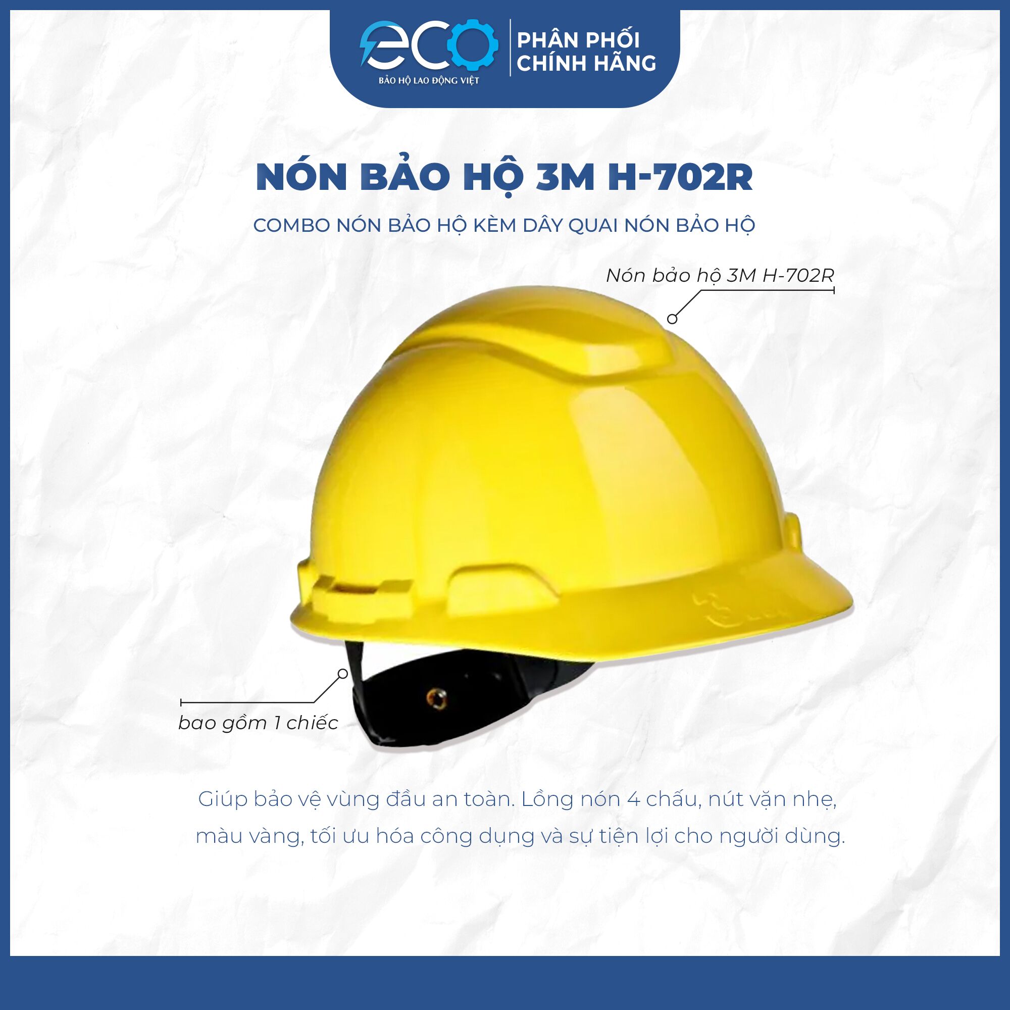 – Hai bên nón có khe gắn, tương thích với các phụ kiện của 3M (chụp tai chống ồn, mặt nạ hàn…).